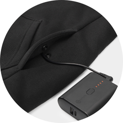 - Pockets: one front kangaroo pocket and one external battery pocket
