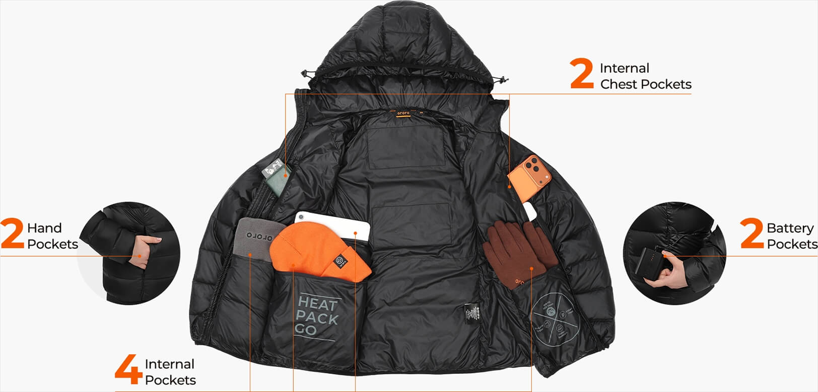 | "ORORO" button (L&R Pockets, L&R Arm, Upper back, Mid-Back) | 3.5 | 5.5 | 9 |