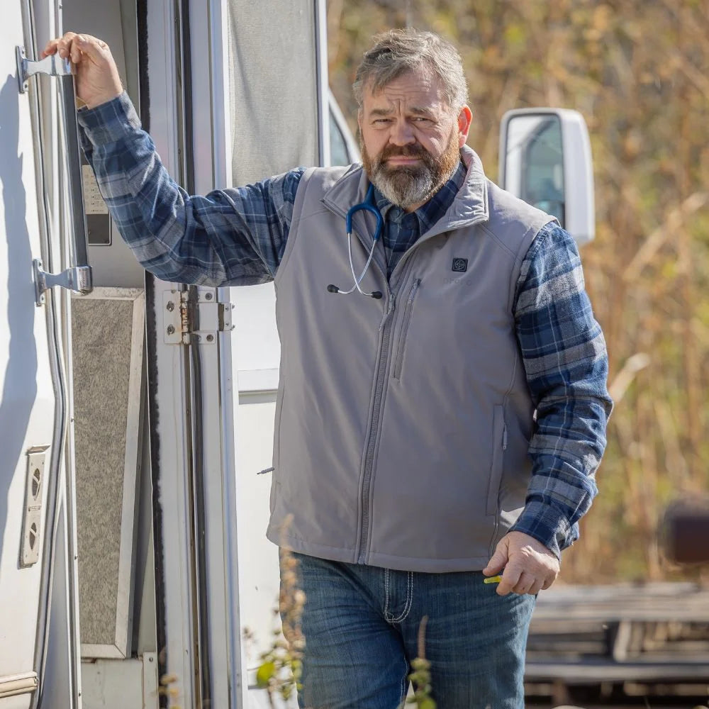 - Functional design featuring multiple pockets, including hand pockets, a zipper chest pocket, and a dedicated battery pocket.