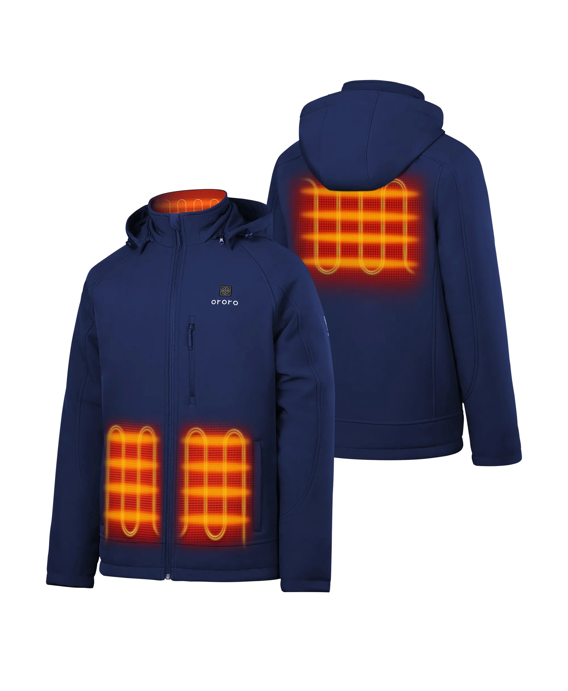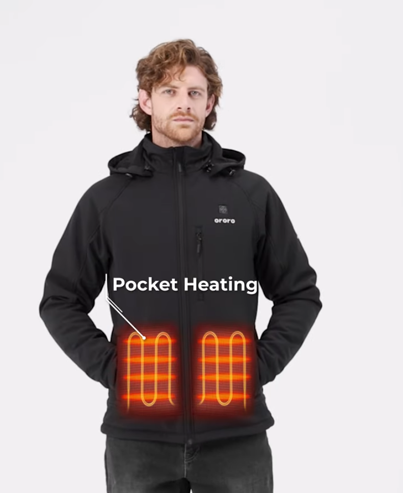 - Four heating zones: left & right hand pockets, collar, and mid back