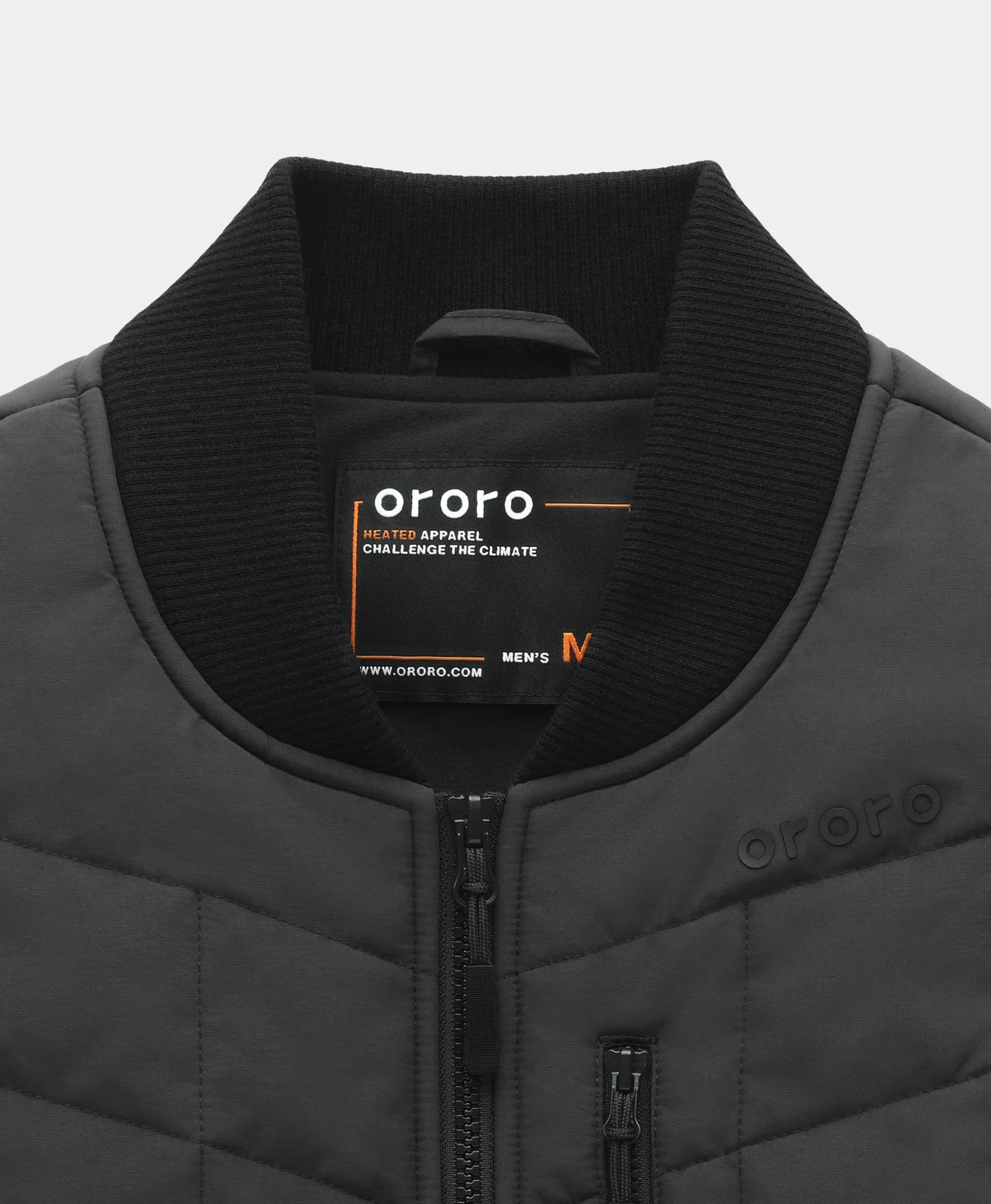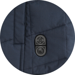 - Dual-control system with two separate power buttons for individual control of the chest/back and hand pocket heating zones