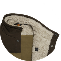 - Sherpa fleece-lined collar with rubber-coated snap closure ensures extra neck warmth and protection.