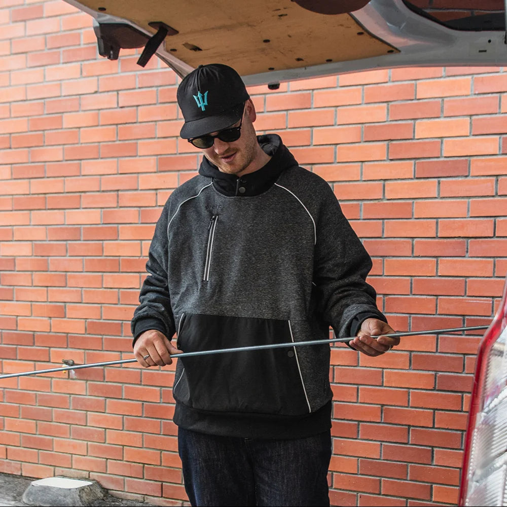 - It features a reinforced kangaroo pocket, a zippered chest pocket, and an external battery pocket.