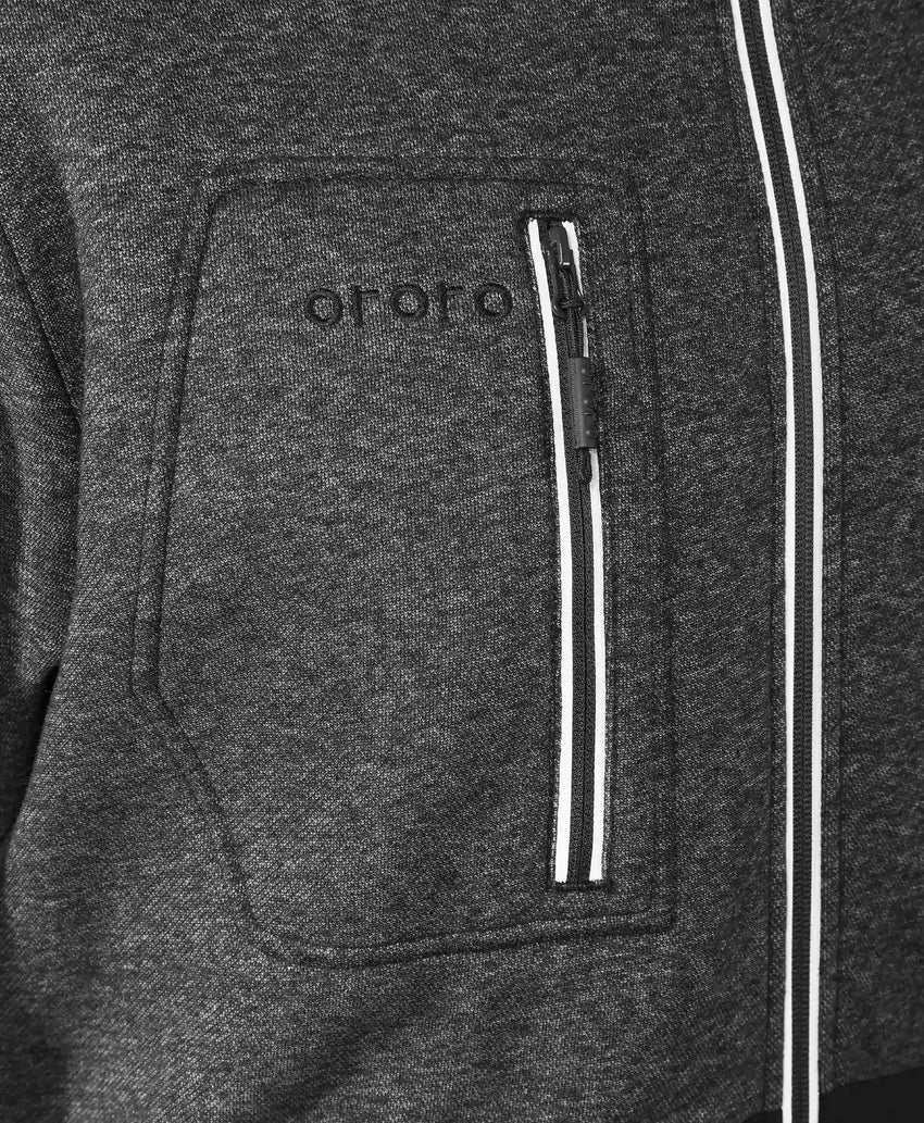 The dual-control system allows you to separately manage the heating zones. One control button (ororo logo) adjusts the heat for the chest and back zones, while the other button (A) controls the left & right arms. This feature lets you customize warmth where you need it most, helping to extend battery life by selectively heating areas based on your needs.