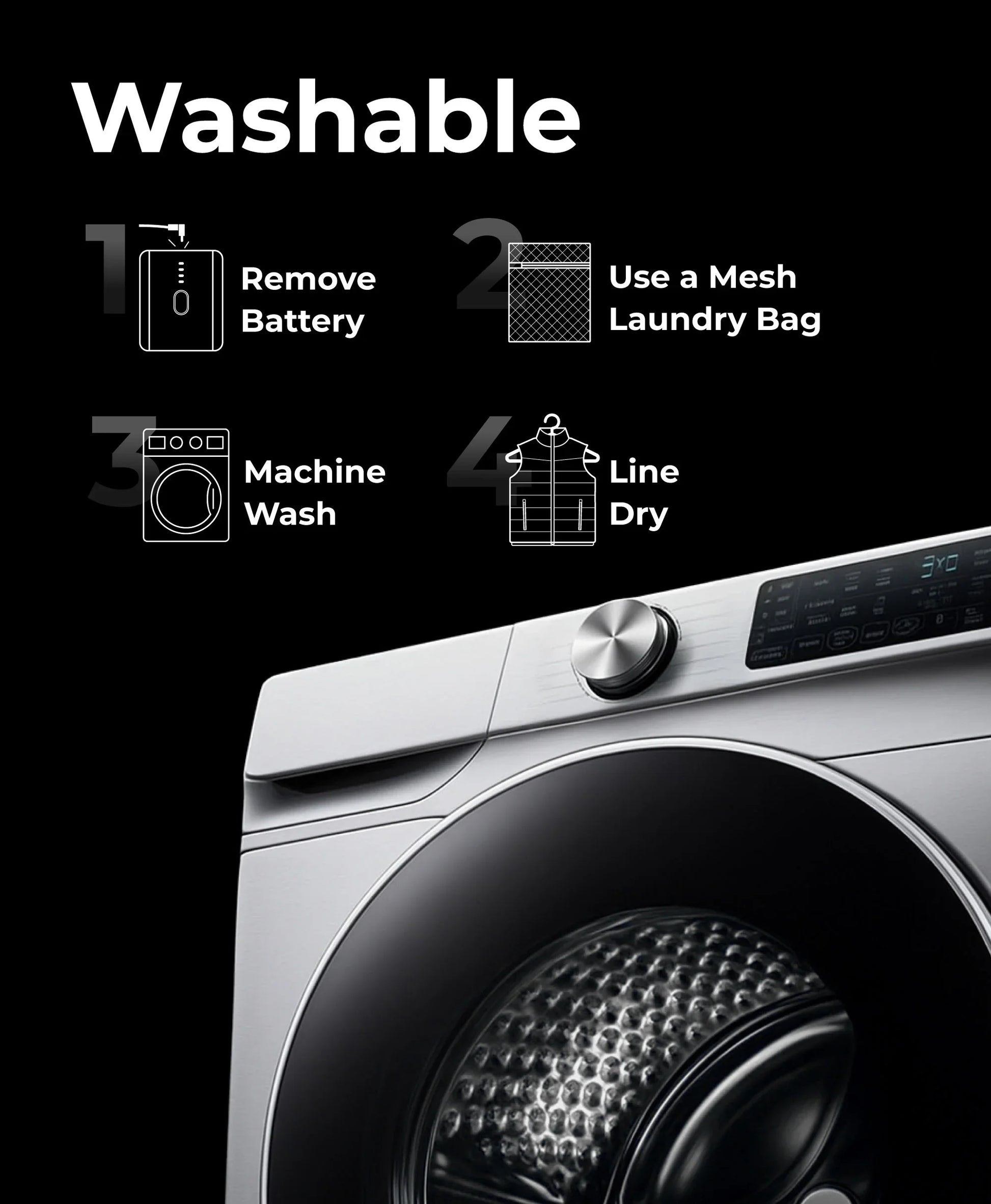 The jacket is machine washable. Disconnect and remove the battery, place the jacket in a mesh laundry bag, and wash on a gentle cycle.